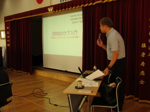 令和7年10月24日(金)真心の園地域交流ホールにて、特定技能職員を対象とした認知症ケア基礎研修「認知症ケア入門」を実施しました。椎原寿恵会 認知症対策監の片平知博氏を講師に招き、17名が研修に参加しました。ミャンマーとインドネシア出身の職員も日本語での研修を真剣に聞き、難しい専門用語など翻訳しながら、約3時間の研修を無事受け終わりました。「難しい内容でしたが受けてよかったです。」という声が聞けました。世界的に認知症は増加傾向にあり発症した際には周囲の手助けを必要とします。今後も正しい認知症の知識を習得できる機会を設け実施していきます。
