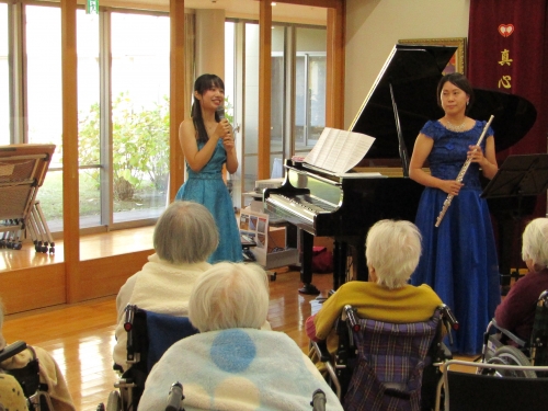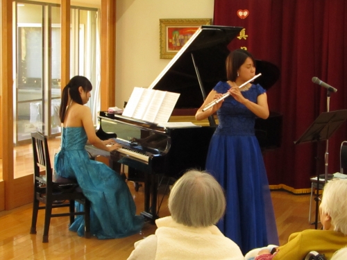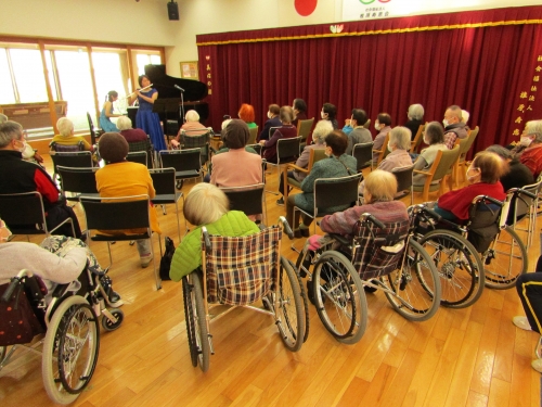 12月3日(水)、鳥栖市・鳥栖市文化事業協会主催によるアウトリーチ(訪問演奏)を真心の園で開催しました。フルート、オカリナ奏者の山野裕子(やまのゆうこ)さん、ピアノ奏者の大塚凪紗(おおつかなぎさ)さんのお二人のアーティストによる素敵な生演奏を楽しみました。真心の園デイサービス利用者様、特養の入所者様など約40人の参加があり、フルートとピアノ演奏が次々に披露されると会場からは感動で目頭を押さえ涙ぐむ様子もありました。また日本の歌や歌謡曲では、皆さん一緒に口ずさみ会場は笑顔であふれ、素敵な冬のまごころ演奏会となりました。